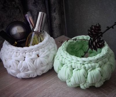 Идеальны для хранения косметики и мелочей. Выполнены из трикотажной пряжи (100% хлопок). Возможен повтор в любом цвете.