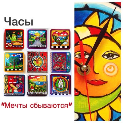 Деревянные настенные часы, ручная работа, художественная роспись. Авторская работа в единственном ёкземпляреАкрил, лак.25/25.Для создания композиции в интерьере часы возможно приобрести в наборе с деревянными картинками и по-своему скомпоновать на стене. Цена за 1 картинку (14,5 х 14,5 см) 1000 руб.