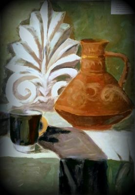 большой постановочный натрюморт с атрибутами античных предметов: краснофигурной кекрамической вазы, гипсовой розетки, и нескольких оттеняющих драпировок.Написан гуашью, на ватмане.в технике сухая кисть, размер А2 60 на 80см, оформлять, Ю оконтовывать в паспорту и багет не стала, каждый имеет возможность оконтовать его по собственному усмотрению.