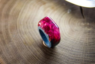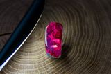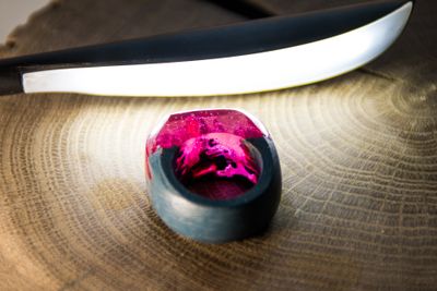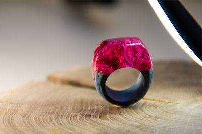 Это колечко сделано на заказ из древесины лиственницы и подкрашенной ювелирной смолы с добавлением небольшого количества люминофора. В темноте имеет приятное свечение бирюзового цвета.