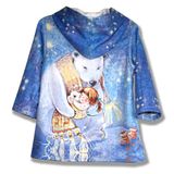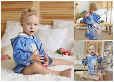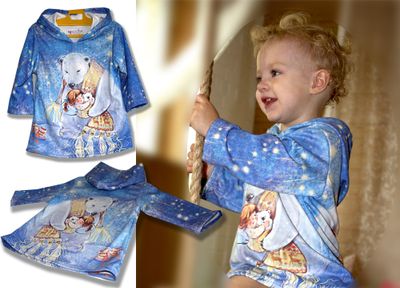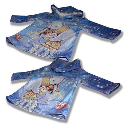 Нарядное, красивое, удобное платье-туника, украшено принтом со сказочным сюжетом. Белый мишка, убаюкивающий девочку на фоне зимнего неба.Модель свободного кроя с длинными рукавами капюшоном будет удобным нарядом на новогоднем празднике. К капюшону можно пришить боа для имитации меховой опушки.Платье сшито из приятного на ощупь трикотажа с матовой поверхностью. Замеры: длина туники по спинке от плечевого шва - 41 см, длина рукава 28 см. Рост модели на фото 86 см. Под заказ возможно изготовление в другом размере. Цена платья зависит от размера: При росте от 56 до 80 см цена 2000 рублей. При росте от 86 до 110 см цена 2700 рублей. Возможно изменить модель платья, убрать рукава, сделать короткий рукав, изменить вырез горловины, убрать капюшон и т.п. Состав: 70% полиэстер, 30% вискоза.