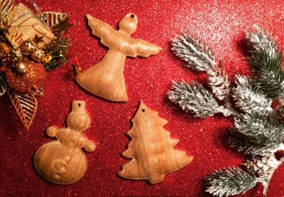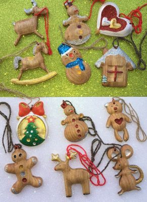 На 1 фото изображены - Елка (малышка) - 1000р и на ней игрушки (60 р) штучка материал ( Фанера) На 2 и 3 фото Дубовые игрушки разукрашенные в ручную и просто покрытые маслом с лаком Лучший подарок на новый год!!!