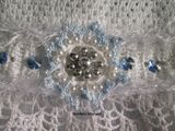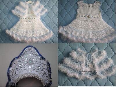 На возраст 3-4 г. Обхват груди=56 см, длина изделия 47- 48 см. Изделие связано крючком, х/б пряжей. Отделка- фантазийной пряжей. Подклад юбки - фатин. Болеро связано из вискозы + фантазийная пряжа. Отделка стразами. Пуговицы со спинки - стразы. Наряд дополнен поясом, украшенным снежинкой с бусами и стразами. В комплект входят митенки - снежинки и корона. Корона в стоимость наряда не входит, прилагается бесплатно. Оплата картой Сбербанка, отправка Почтой России. Алтайский край. Возможна покупка одного платья, цена-1500 р.