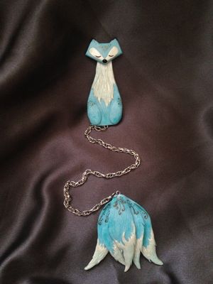 Закладка ручной работы из полимерной глины, изображающая лису из японских легенд. Состоит из двух частей - тельца лисички и пяти хвостов, соединенных между собой цепочкой.