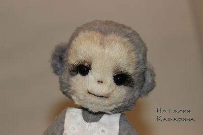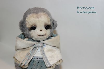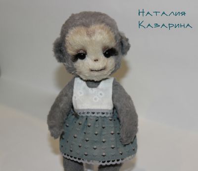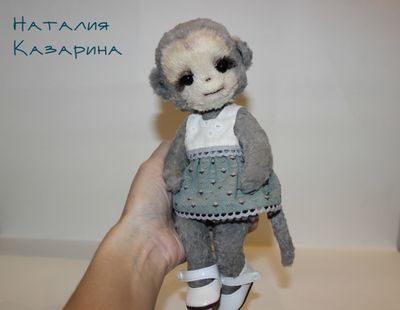 Сшита полностью руками из вискозы, внутри опилочки хвойных пород и мет. гранулят. Тонирована. Из-за специального кроя нижних лапок стоять не может,но очень хорошо сидит на краю. Хвостик армированный. Одежда сшита полностью руками : накидочка с капюшоном из микроплюша; платье из японского хлопка. В комплект входит подставка для кукол. Приедет в новый дом в подарочной коробочке с паспортом. Доставка по России 250 руб.