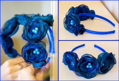 Основа - ободок пластик, оплетен атласной лентой. Цветы - шифон, бусины.