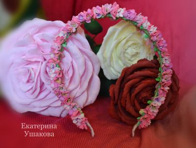 Ободок с цветочками из фоамирана "Весна",выполнен полностью в ручную, окрашен каждый цветочек,наполнен весенним настроением) Очень нежно,по весеннему смотрится.Станет милым украшением для прекрасной половины человечества) Рекомендации по уходу Изделия из фоамирана не боятся воды и солнечных лучей.Но могут погибнуть при высоких температурах (утюг,плойка, огонь)