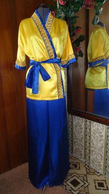 Домашний костюм из атласа с кружевом. Красивый и удобный. Конструкция пояса, у верхней части костюма, дает возможность четкой фиксации изделия на талии, поэтому при носке изделие не распахивается и не смещается. Размеры с 42 по 52. Выполню на заказ.