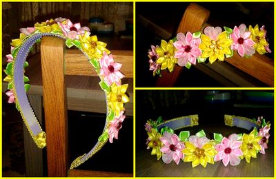 нет в наличии. На заказ! Основа - ободок пластик, оплетен тесьмой. Цветы - атласная лента, бусины.