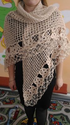Шаль бежевого цвета. Размер 2х1х1м. Вязка: соломонская + цветы. Крючок. Теплая и нежная пряжа.
