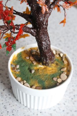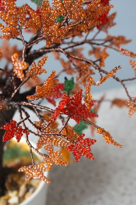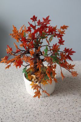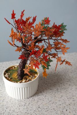 Деревце сплетено из бисера. Ствол- проволочный каркас,усилен гипсом и текстурной пастой. Леревце посажено в вазон и задекорировано.