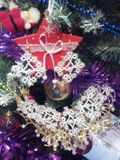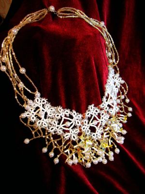 Авторское ожерелье из бисера, кристаллов Сваровски и бусин "под жемчуг". Состоит из пяти снежинок и множества подвесок из кристаллов Сваровски и бусин. В коплекте с серьгами