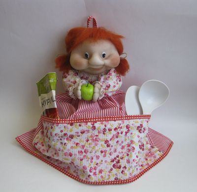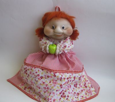 Украсить кухню и организовать на ней рабочее пространство поможет кукла пакетница. Наша пакетница Маруся выполнена в чулочной технике. Она яркая, веселая, жизнерадостная. Глядя на нее, хочется улыбнутся. С такой подружкой хорошее настроение гарантировано на целый день. Такая кукла - оригинальное решение хранения пакетов, мешочков и разных мелочей. Это отличная идея для подарка хозяйке на любой случай. Юбка-мешок - съемная, пристегивается пуговичками к телу куклы. Фартук тоже можно снимать. Поэтому их можно стирать так часто, как нужно. Верхняя часть куклы подлежит только сухой чистке. Ну а в руках у нашей красавицы - сочное яблоко! Сверху есть петелька, и такую куклу-пакетницу можно вешать на крючок. На фартуке есть три кармана. В них можно положить пакетики с приправами, лопаточки, ложки (что угодно!)