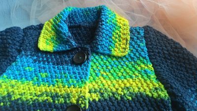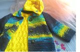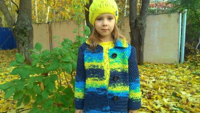 Яркое, необычное пальто для малышки, которая хочет быть заметной! В данном пальто, выполненном из ленточной хлопковой пряжи, можно ярко выглядеть как в комплекте с джинсами, так и в комплекте с таким ажурным пуловером и беретом. Изделие хорошо держит форму. Пальто имеет застежку впереди на три большие пуговицы. Длина изделия 52 см, рукав втачной, его длина 38 см, ширина груди под проймой 33 см. На фото девочке 5 лет, ее размер 110-116.