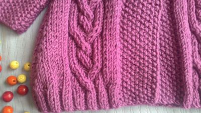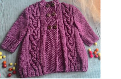 Модель выполнена из полушерстяной пряжи с аранами по переду и двубортной застежкой на шесть пуговиц. Спинка пальто без узоров. Длина изделия 44 см, длина рукава 30 см, ширина груди под проймой 30 см