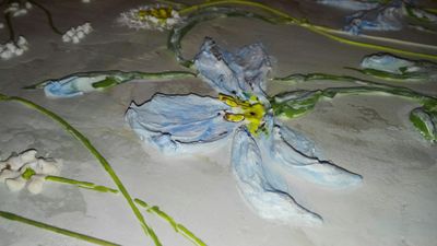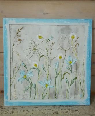 Панно выполнено акриловой шпатлевкой и акриловыми красками.В картине доминирует голубой цвет вызывающий приятные ассоциации, связанные с небесно-голубым небом и бескрайними морскими просторами.Цветочный пейзаж подарит вашему дому успокоение и гармонию. Размер 40х40 см Стоимость указана с рамой.