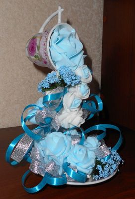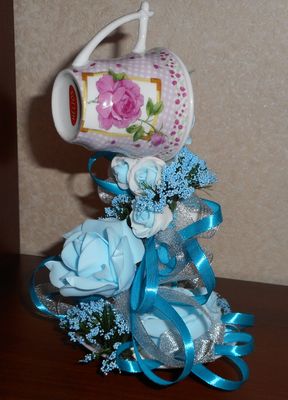 Кофейная чашка, украшенная цветами из фоамирана, атласными лентами и мелкими стразами. Отличный подарок к любому празднику)))