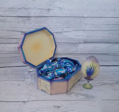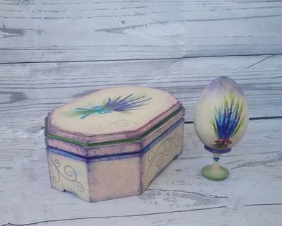 Шкатулка с яйцом расписаны в стиле Прованс. Акрил, лак. Шкатулка на магнитике. Яйцо размером 9 см без подставки и 12 см с подставкой.