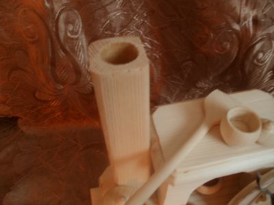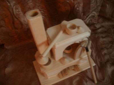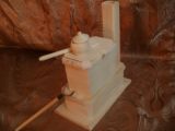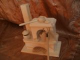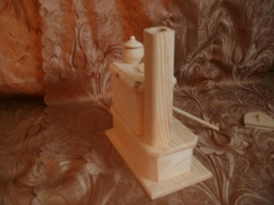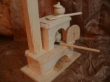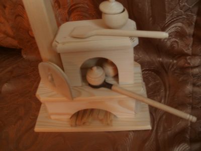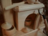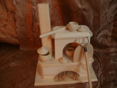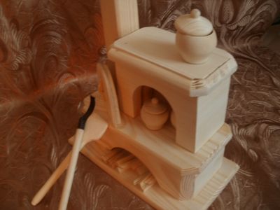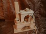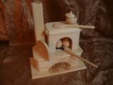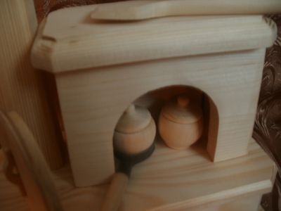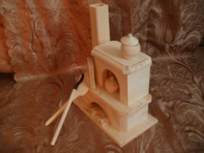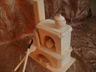 Печь. Материал - массив дерева. Размер общий : 18 (длина)*10(ширина)*22 высота) см В комплекте со всей утварью : 3 чугунка с крышками, ухват, лопатка для хлеба ( деревянный ухват), заслонка, дровишки