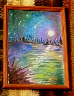 небольшая работа выполеннав современной технике,яркий,немногго фантастический ночной ,лунный пейзаж, создан цветными карандашами ,формат а4