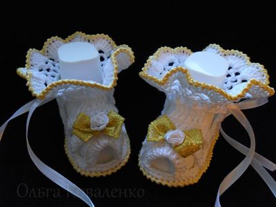 Очень красивые и нежные пинетки- сандалики украсят ножки вашей принцессы! Летние ажурные пинетки для девочек связаны из х/б ниток, украшены бусинками и ленточками. А так же прекрасный подарок для будущей мамы или новорождённой малышки!!! На заказ могу выполнить в любом цвете и по вашим размерам.