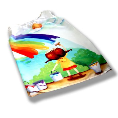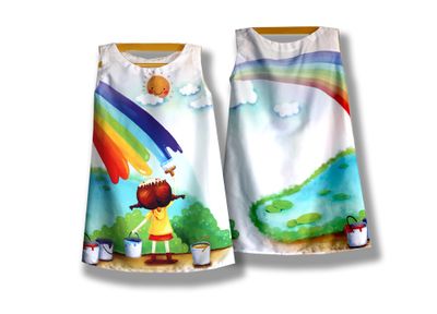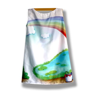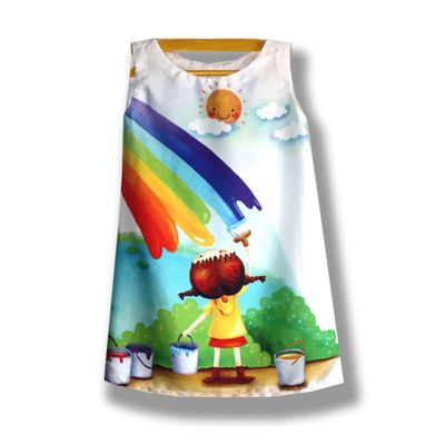 ороткое простое платье без рукавов с детским принтом "Нарисованная радуга". Материал сатин-стрейч. Белое платье-туника без рукавов должно быть в гардеробе юной леди! Во-первых, это модный атрибут летнего образа, во-вторых, платье-туника с крупным выразительным ярким принтом прекрасно подойдет и на каждый день, и на выход. Платье имеет легкий трапециевидный силуэт и выполнено из легкой ткани имитирующей шелк, что очень важно для комфортной носки. Оно выглядит скромно, при этом очень изысканно и благородно! Купить белое текстильное платье без рукавов с красивым детским рисунком - значит приблизить долгожданное лето. В боковом шве рисунок переходит от переда к спинке. Цена платья зависит от размера: При росте от 56 до 80 см цена 2000 рублей. При росте от 86 до 116 см цена 2500 рублей. При росте от 122 до 134 см цена 2700 рублей. При росте от 140 до 158 см цена 3000 рублей. Платье изготавливается под заказ. Вы можете купить платье любого размера. Закажите комплект «Family Look» - платье для мамы и дочери. Возможно также изменять фасон, например добавить или убрать рукава, изменить вырез горловины. Пишите все ваши пожелания в комментариях к заказу. Мы хотим, чтобы вы остались довольны покупкой и носили выбранную вещь долго и с удовольствием. Ручная работа! Точное повторение невозможно!