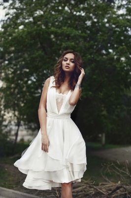 Женственное,легкое,воздушное платье приталенного силуэта с V-образным вырезом по переду с декоративной вставкой из тончайшего кружева. Драпировка на лифе полочки и спинки. Юбка фигурная, состоит из 3-х слоев. Материал платья : натуральный шелк, подклад вискоза Размер 42-44 дизайн SHVEA