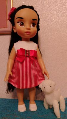 На Дисней куклу 40 см. Сзади по всей длине платья застёжка на очень маленькие кнопочки для удобства одевания. Спереди красивый большой бант из шелка.