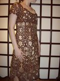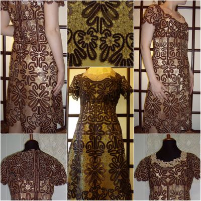 сплетено на коклюшках в технике "Елецкое кружево". Силуэт с завышенной линией талии и широкой юбкой, лиф с круглым вырезом. Рисунок с декоративно-растительным орнаментом. Сочетание нескольких цветов (Шоколадный,бежевый). Изделие продаётся без чехла.При смене цвета чехла изделие заиграет новыми красками и будет смотреться по-другому