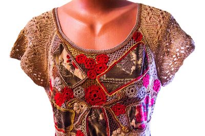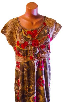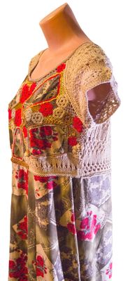 Изготовление: Работа представлена для примера Описание Платье выполнено в смешанной технике (трикотажная ткань скомбинирована с вязанием): юбка в стиле годе, лиф связан крючком в технике наборного кружева. Модель очень нарядна и комфортна, сочетает преимущества сшитых и связанных вещей. Автор: Измайлова Т.В. - Studio Vita700 Размеры 52-54 Материалы трикотажное полотно, хлопок, хлопок с вискозой