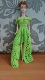 Вязаное крючком платье для куклы. Ажурная длинная юбка с лиственным узором, в комплекте с которой можно выйти в свет, превращается в легкую шаль на плечи для прогулок прохладным вечером. А короткое платье без накидки (или дополнительной юбки) можно надеть для дневных походов по делам.