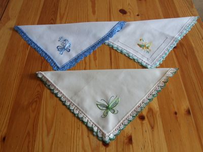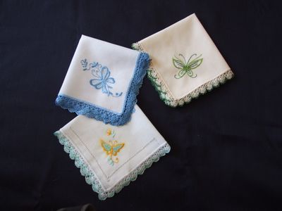 Платочки носовые с вышивкой бабочек,полностью ручная работа :кружево,вышивка.В наличии три платочка.Продажа или заказ не менее двух штук.Цена указана за 1 платок.Оплата наличными при личной встрече,возможна отправка почти при 100%-ой преждоплате.Тел.89164023191