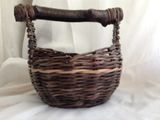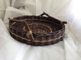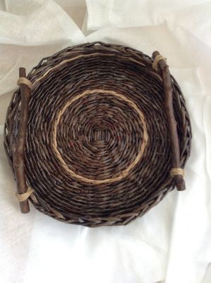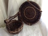 Прочный и легкий набор с деревянными ручками сплетен из газетной бумаги покрашенной водной морилкой - цвет "палисандр" , покрыт акриловым лаком. Станет украшением любой кухни. Очень практичный и функциональный. Набор состоит из двух предметов - подноса и корзинки. По Вашему желанию предметы могут быть проданы по отдельности, и могут быть сплетены в другом цвете. Размеры: диаметр подноса 29 см., высота без ручек 5 см., корзинка диаметр дна 14 см., вверху диаметр 17 см