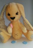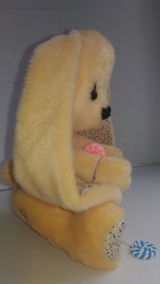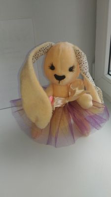Зайка выполнен из мягкого плюша, в ушках ткань хлопок. Наполнитель холлофайбер. Юбочка снимается, выполнена из фатина и атласной ленты.