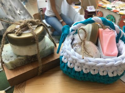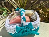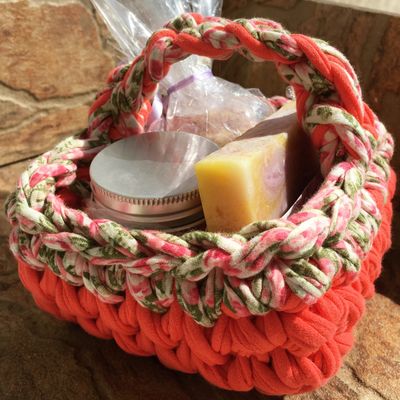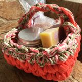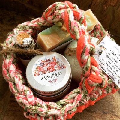В состав набора входит: Вязанная корзина 10/10/6 Мыло с нуля-1шт Взбитое масло Ши-1шт Бомбочка для ванны-1шт Инфуз(масло на травах)-1шт