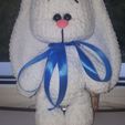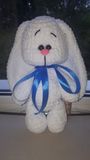 Зайка связан из плюшевый пряжи. Наполнен синтепухом.