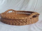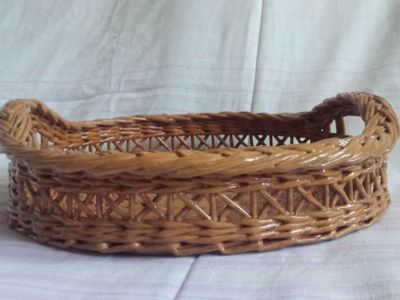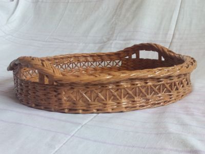 Нет в наличии - продан! Возможно изготовление на заказ. Поднос выполнен из бумажной лозы и покрыт лаком. Он легок и функционален, по своей прочности не уступает изделиям из природных материалов, а лаковое покрытие делает его влагостойким. Ажурный рисунок плетения придает ему легкость и воздушность, а декоративная коса по кромке изделия добавляет красоты. Поднос снабжен удобными прочными ручками. Может использоваться и как элемент декора, и по прямому назначению. Этот поднос станет прекрасным украшением интерьера, создаст дополнительный уют и красоту вашего дома. Размеры: диаметр - 41 см, высота - 6 см. Цвет: грецкий орех. Поднос может быть изготовлен в любой цветовой гамме.