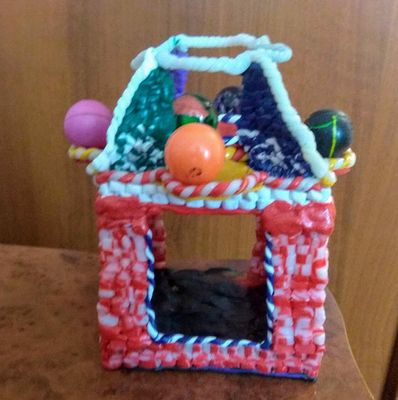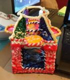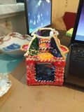 Домик из полимерной глины, высота около 15 см, ширина и длина - около 9-10. Внутрь легко вставляется свеча среднего размера (либо несколько маленьких), на крыше приспособлены подставки для 5 маленьких круглых свечек.