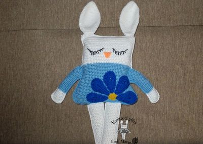 "Зайка-сплюшка". Это игрушка-подушка станет любимцем вашего малыша. Ей можно поиграть и полежать на ней. Размер 40*12 Связан из хлопковой пряжи. У зайки есть свой пледик и он будет вам в подарок.