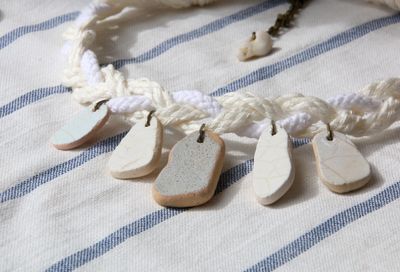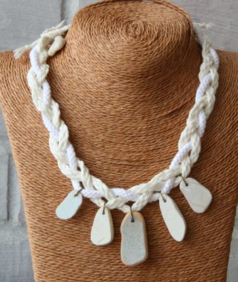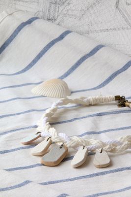Простой, наивный подвес из кусочков керамики обточенной морем на хлопковых шнурах. Украшение в coastal style, напоминающее облака, бегущие над водной гладью или многочисленные паруса регаты. На ОШ около 42 см., удлиняющая цепочка 10 см. Материалы: керамика, хлопковый шнур.