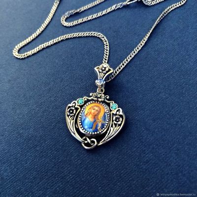 Нательная иконка из серебра с финифтью и фианитами, тщательно проработанная до мелочей, представляет собой произведение искусства как с наружной стороны, так и с задней. Даже на петельке с обратной стороны есть орнамент. Также на заказ можно сделать подобную иконку с любым святым, и подобрать цвет камней на ваш вкус. Цепочка в комплект не входит.