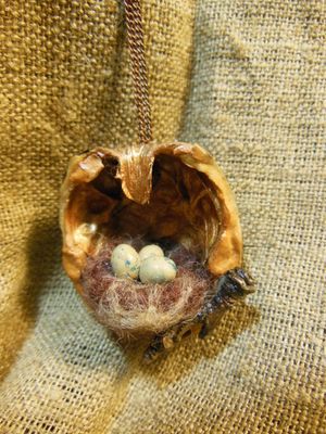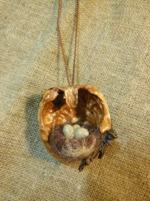 Украшения из скорлупы грецкого ореха, внутри гнездышко с яйцами..