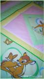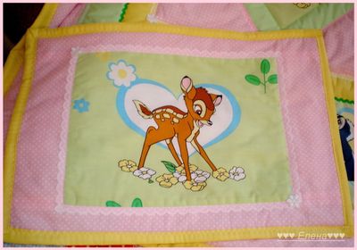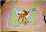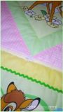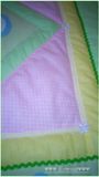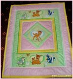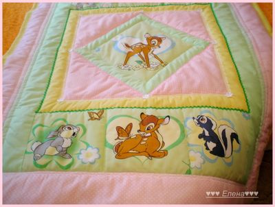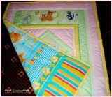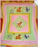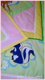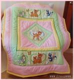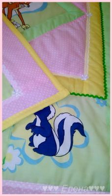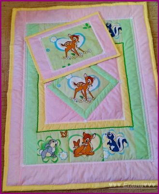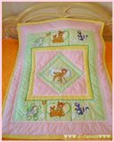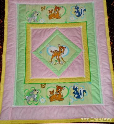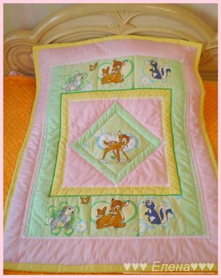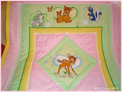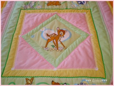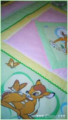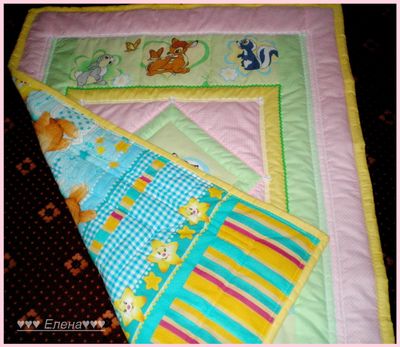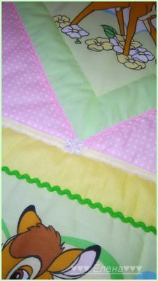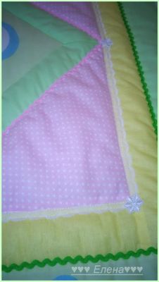 Покрывало сшито из 100% хлопка , наполнитель- синтепон , украшено тесьмой и кружевом . Размер 110*130см