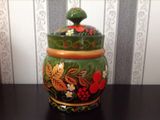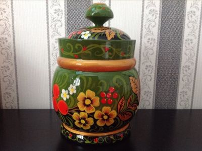 Поставок из дерева расписанный вручную в технике хохлома. Внутри не окрашенное дерево. Пригоден для хранения продуктов.