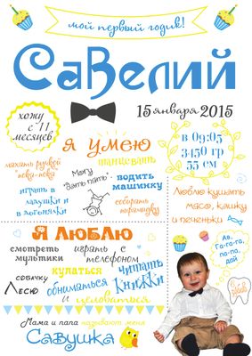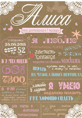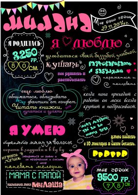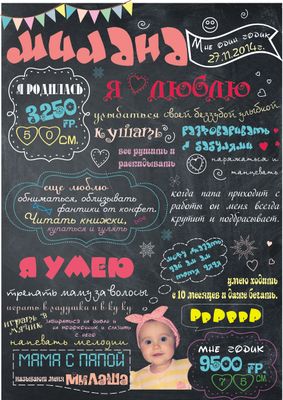 Как много важного и интересного происходит в первый год жизни малыша? Этот период самый насыщенный успехами Вашего ребенка: прорезались первые зубки, вы научились сидеть, ходить и говорить – маленькие, но уже победы!! Дети растут быстро, а сокровенные моменты хочется запомнить и сохранить навсегда для своей семьи. Метрика в стиле меловой доски - лучший способ сохранить самое важное на память, в ней вы сможете рассказать ВСЁ, чем запомнился вам первый год жизни сыночка или дочки. Компьютеры и телефоны ломаются, записные книжки теряются, а картина-постер вряд ли сможет пропасть со стены незаметно)) Постер в стиле меловой доски будет оригинальным подарком на долгую память бабушкам и дедушкам и станет хорошим дополнением в интерьере детской комнаты. А какие красивые фотографии вашего малыша получатся на фоне постера с ЕГО достижениями!!