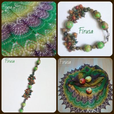 Комплект из ажурной полукруглой шали "Фрея" и браслета-компаньона. Шаль связана спицами из латвийской шерсти секционного окрашивания Дундага, вес ок. 150г. Браслет выполнен из индийской яшмы, варисцита, яшмы Пикассо, длина ок. 18 см. Стоимость при покупке раздельно - 2500 руб и 1500 руб.