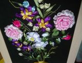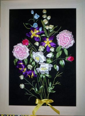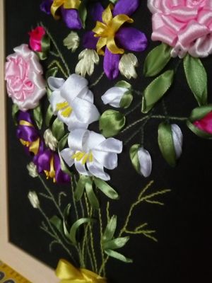 Картина вышита на канве атласными лентами и нитками мулине ,использовала искусственные тычинки,картина в рамке без стекла