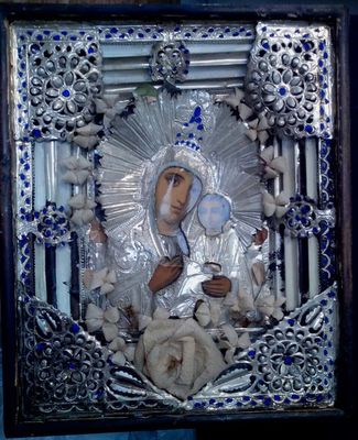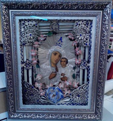 Старинная икона конца 18-го века. Декорирована паспарту под серебро ручной резки. Стекло - музейное, его еще называют "невидимкой" - ощущение отсутствия стекла. Отлично защищает работу от ультрафиолета, т.е. от выгорания. Багет - пластиковый.