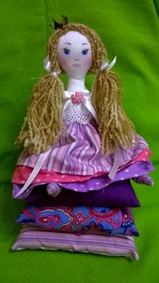 Принцесса на горошине. Куколка на подушках. Волосы - нитки хлопок + акрил. Ручная роспись лица. Ручки двигаются - пуговичное крепление. Ручная роспись лица акриловыми красками. Рост принцессы 25 см, высота подушек 12 см.