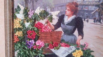Вышивка по принту, 30*40 , атласные ленты , цветные и белые окрашенные вручную, без багета стоимость изделия дешевле.
